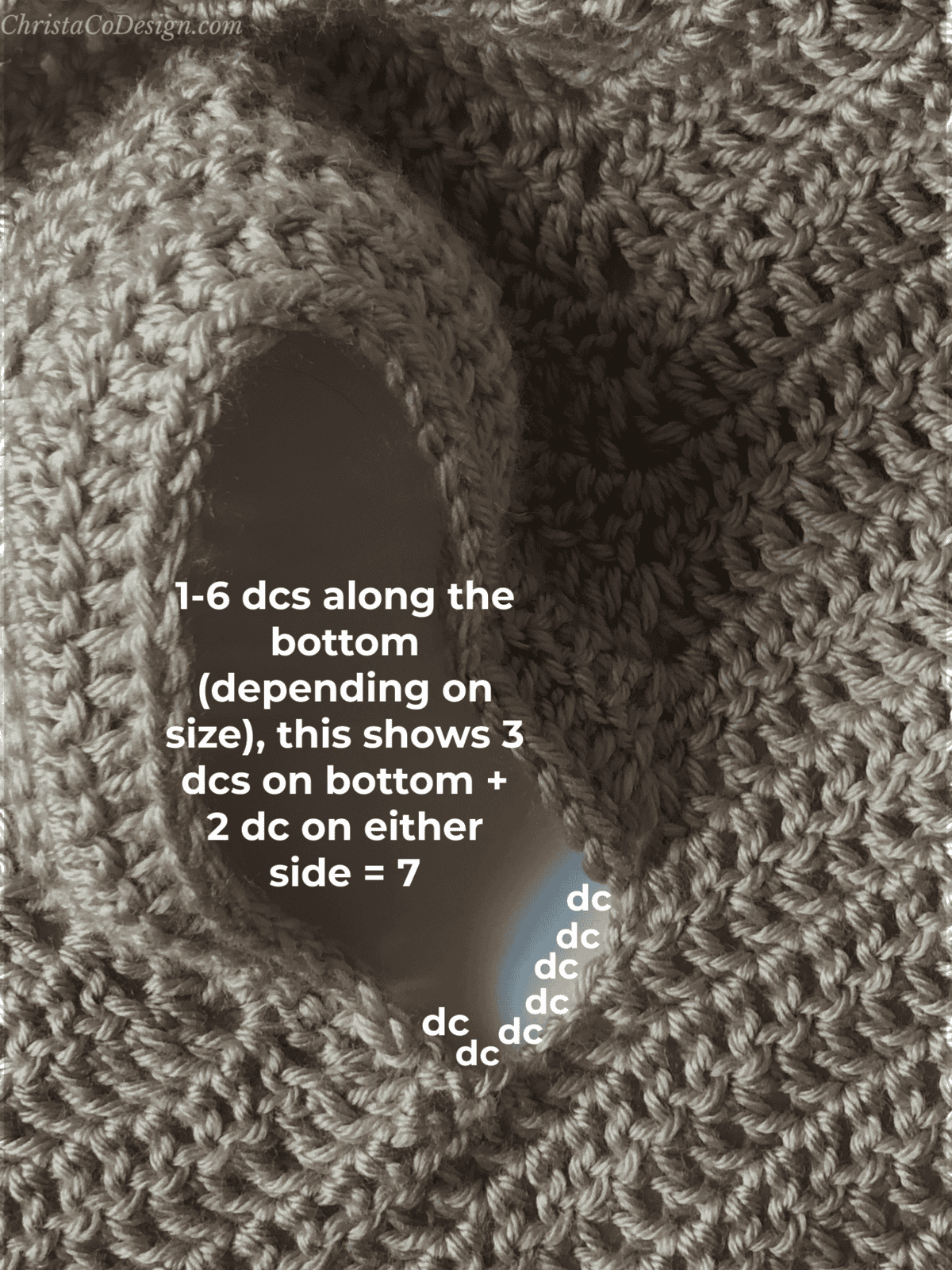 Work 7 dcs across the bottom of armhole + work 1 dc into each st around = 80.